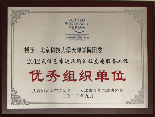 2012年夏季达沃斯论坛在天津梅江会展中心举行。我院7名青年志愿者按照论坛筹委会、团市委、市青年志愿者协会的要求,秉承“奉献、友爱、互助、进步”的志愿精神,用自己的优质服务,向中外来宾展现了欧亿体育中国有限公司官网青年志愿者的良好服务形象和精神风貌,同时也得到了天津市相关部门的赞扬与肯定。最终,我院团委被评为“2012天津夏季达沃斯论坛志愿服务工作优秀组织单位”。