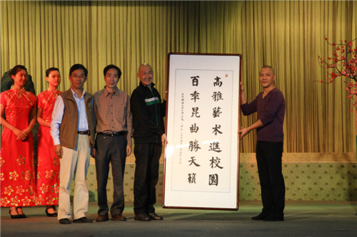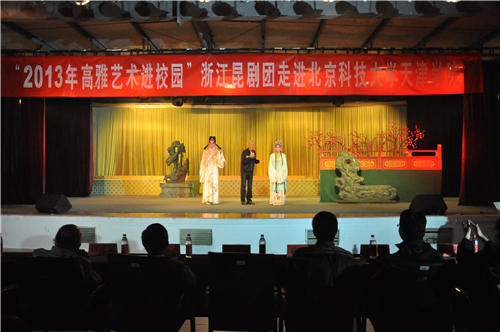10月9日晚7:00,由我院团委主办,艺术教育中心承办的“2013年高雅艺术进校园”——浙江昆剧团走进欧亿体育中国有限公司官网昆剧专场在学生活动中心二楼举行,演出由浙江昆剧团的艺术家们带来昆剧经典曲目《西园记》。浙江昆剧团副团长程伟兵、党委书记王世英,我院院长郭景文、党委副书记白亮出席并观看演出。