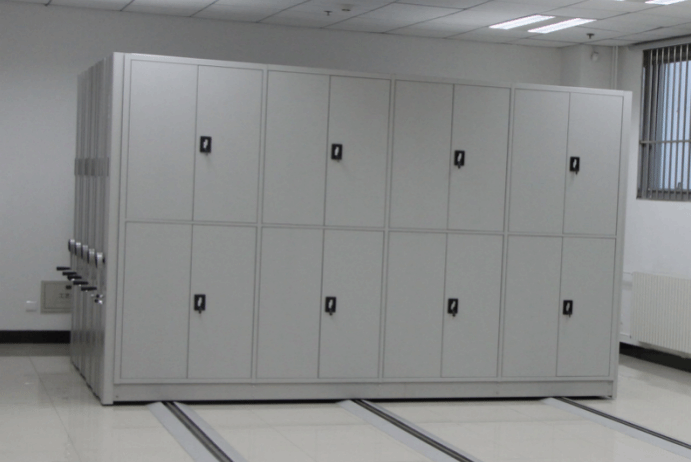 8 | 安全防护装置 | 1.防尘:密集架顶部安装有防尘板,架体列与列之间安装厚度≥20mm密封橡胶条,采用金属压条将胶条与架体紧密固定。 2.防盗:首列密集架安装有总锁,架体全部合拢时可以锁住,保证安全。 3.防倾倒:底盘上安装有安全勾,与轨道相连,可防止架体倾倒。 4.限位装置:轨道末端安装限位块,防止密集架运行过程中脱轨。 5.制动装置:每列密集架侧面安装定位锁,防止架体打开使用过程中被意外移动,保证人员人身安全。 |
