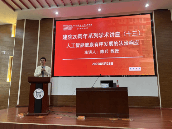 2025年5月28日15时,建院20周年系列学术讲座第十三讲在理工馆学术报告厅成功举办。南开大学法学院副院长陈兵教授为师生们带来了一场以“人工智能健康有序发展的法治响应”为主题的精彩讲座。此次讲座由法律系系主任朱京安教授主持,法律系部分教师及150余名学生参加了本次活动。