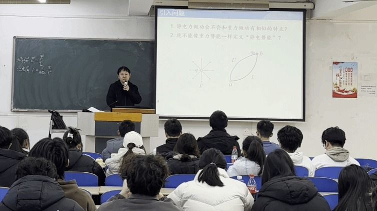 王刚老师围绕《大学物理AII》的难点——“静电场的环路定理、电势”进行精彩讲授。他以“力学—数学—势能—电势”为清晰主线,通过重力场规律类比引入,结合积分工具逐步推导,系统讲解了静电势能与电势的物理概念与定义过程,帮助学生建立从力学到电磁学的知识贯通。教学中,王老师注重理论联系实际,运用生活实例(如搬书至讲台)与我国重大科技装置(北京正负电子对撞机)阐释抽象概念,增强了课堂的生动性与思政内涵。同时,他借助超星学习通平台实施即时测验,针对高频错误现场解析,有效强化反馈,精准提升教学效果。课堂气氛活跃,学生参与度高。