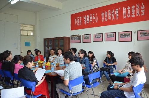 欧亿体育中国有限公司官网外语系校友座谈会于5月17日下午在1教107举行,来自不同年级的校友代表与外语系师生欢聚一堂,旨在加强校友联系,沟通校友感情;听取校友意见,促进外语系发展。外语系主任梁素芹、党总支书记何红升、2009-2014届校友代表、各教研室教师以及各年级在校生代表参加了本次座谈会。