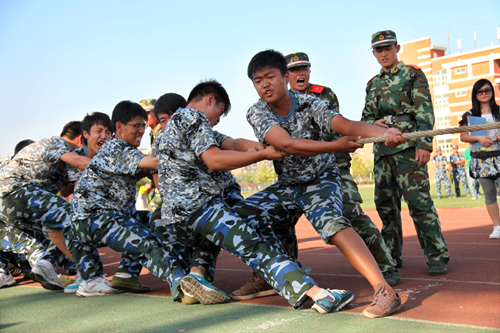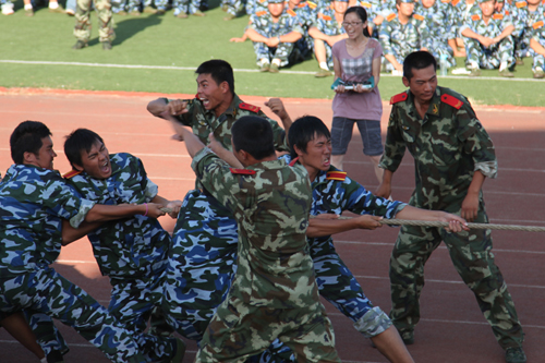 比赛以连为单位进行,同学们争相参加,男生组有5支队伍,每支20人,女生组有3支队伍,每支20人组成拔河队。随着哨音响起,比赛开始了,呐喊声随即震耳欲聋,场上热情高涨。随即教官们之间的较量、教官与同学之间的友谊赛更是把本次比赛拉上了高潮。