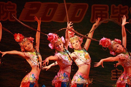 晚会以“云水约定”为主题,分为“云水记忆”和“约定未来”两个篇章。本次毕业生文艺晚会舞台设计新颖,在主舞台前方延伸出正方形副舞台,在副舞台两侧还安排2010届毕业生观众,加强了表演者与观众的交流。随着管弦乐合奏的徐徐响起,晚会正式拉开帷幕。激情昂扬的《加勒比序曲》,节奏欢快的《五声神韵》,将现场观众的热情充分调动起来。热烈的掌声中,我们迎来了晚会的第一个节目歌伴舞《美丽的草原我的家》。演唱者行云流水般的歌声,让人感觉仿佛置身于草原之中,体验着那份清新与自然,享受草原的宁静。接下来是由学生艺术团带来的舞蹈《俏花旦》,它以中国传统方式京剧为渊源,用不同于京剧表演的全新方式演绎而来。表演者动作灵活敏捷,宛如一个个舞动的精灵。