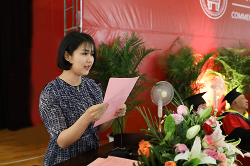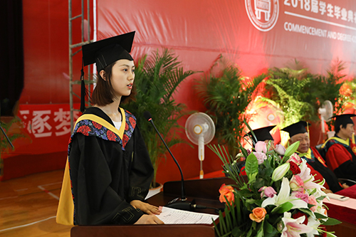 典礼在雄壮的国歌中开始。副院长张永锋宣读优秀毕业生名单;党委副书记孟菲菲宣读优秀毕业论文名单;财务总监王俊敏宣读报名大学生志愿服务西部计划名单;院长助理汪飞星宣读报名预征入伍学生名单;材料与科学工程系材料1401班的孙烨同学代表全体毕业生发言,她向母校和师长致以衷心的感谢,同时也祝福在场的各位同学实现梦想,在未来写就属于自己的精彩篇章;外语系教师黄文靖作为教师代表发言她希望大家以梦为马,莫负韶华,带着知识和激情,将个人的发展与时代的进步融合在一起,在最富有创造力的青春年华,发出时代最强音!