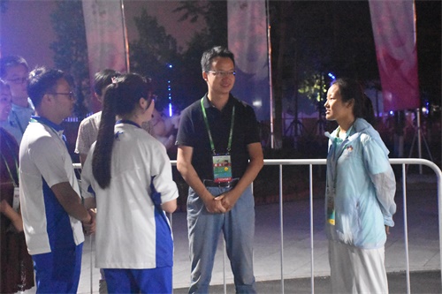 随后我院志愿者督导教师林小茹为叶振楠同志一行分别介绍了观众咨询台、播报、信息技术、转播助理、行政接待、混合采访区、场馆运行、检录区、医疗保障等岗位的志愿服务开展情况。叶振楠同志看到馆内志愿者们认真工作的志愿者风貌,由衷的称赞了志愿者们一丝不苟认真负责的精神态度。