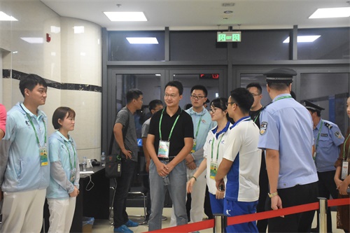 叶振楠同志一行在志愿者督导教师和学生志愿者代表的引领下进入场馆,首先来到了检票处慰问了票务志愿者。票务组是唯一一个在场馆外开展志愿服务的岗位,志愿者每天与高温、烈日交战。叶振楠同志细心询问了负责检票的志愿者们的身体情况,是否有避暑措施,并为他们不辞辛苦、坚守岗位的志愿服务精神表示赞许。