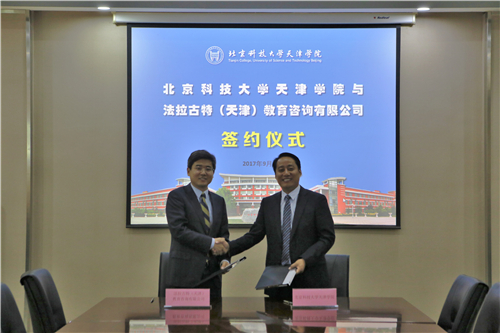 2017年9月8日,我院与美国法拉古特学校天津校区举行战略合作协议签约仪式。出席本次签约仪式的双方领导及嘉宾有:美国法拉古特学校中国区总校长杨晓柯、法拉古特学校天津校区招生办主任吴积宗、AFA项目部主任吴莹和分校区主任李维,天津学院副院长张永锋、学生处副处长孟祥瑜。