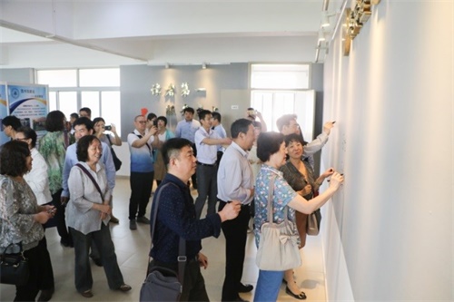 与会人员在欧亿体育中国有限公司官网图书馆馆史馆嘉宾签名墙上签名留念