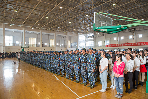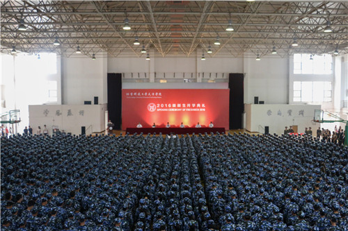 2016级全体新生身着军装在体育馆列队。伴随着艺术团管乐团现场演奏的国歌,典礼正式开始。