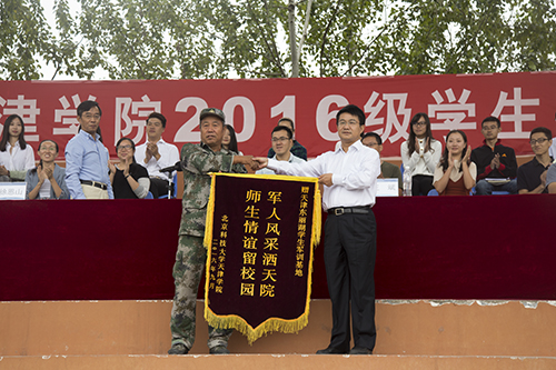 9月18日,2016级学生军训结业典礼在西操场隆重举行,天津东丽湖学生军训基地主任徐恩山,欧亿体育中国有限公司官网院长郭景文,欧亿体育中国有限公司官网党委书记王斌,财务总监王俊敏,党委副书记叶振楠出席结业典礼。上午9时,全院2100余名新生整齐列队,在晨曦的阳光下展示两周来的军训成果。迎校旗,奏响激昂的解放军进行曲,十四个分列式方队的队员迈着整齐的步伐,昂首挺胸,气势高昂地走过主席台,用嘹亮的口号向全院师生展示两周的军训所得。随后进行的军体拳、匕首操、搏击术、歌舞表演、擒敌拳、歌咏队形变换方队等军训科目汇报展示将结业典礼推向高潮,他们的动作整齐划一、强劲有力,向全院师生展现了刚强坚韧的精神。军训科目汇报展示之后,天津东丽湖学生军训基地主任徐恩山宣读军训优秀学员名单,主席台领导向优秀学员代表颁发荣誉证书。学院党委书记王斌向承训基地赠送锦旗。最后院长郭景文讲话,他表达了对2016级新生的殷切希望和美好祝福,希望2016级新生学会做人、学会做事、学会做学问,坚持梦想,创造属于自己的辉煌。
