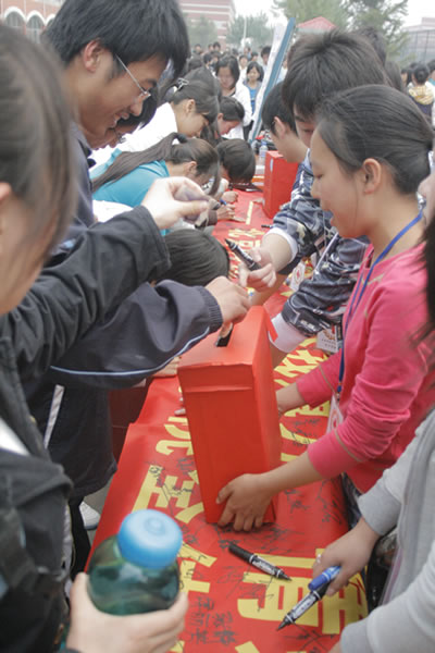 北京科技大学校长助理、天津学院院长张文明教授将捐款投入募捐箱内,并在写有“众志成城,抗震救灾,尽我薄力,情系灾民”的条幅上签下自己的名字,学院领导及中层领导干部、广大师生们纷纷捐款并在条幅上签字。表达关注灾情的心意及祝福灾区人民的爱心。