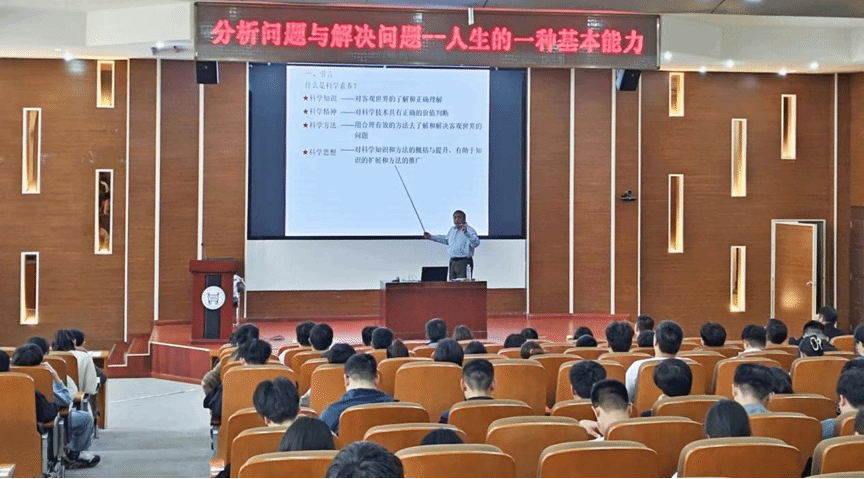 朱超甫教授先由“什么是科学素养”导入话题,指出无论是工作还是生活,都是一个不断面对问题、解决问题的过程。成功解决问题并非易事,它需要我们深入剖析问题的根源或真实状态,而这正是通过科学分析问题来实现的。因此,对于每个人来说,分析问题与解决问题不仅是一种技能,更是一种生活智慧。从而提出要培养学生分析问题与解决问题的能力,要能学以致用把学科知识运用到工作和生活中去。朱教授结合在工程实践中的多个成功案例,深入浅出地讲解如何运用“分析问题与解决问题”的思路与方法。他分享了如何准确识别问题、如何系统分析问题,以及如何高效解决问题的方法和技巧。这些方法和技巧不仅适用于工程领域,更可以广泛应用于我们日常生活的各个方面。