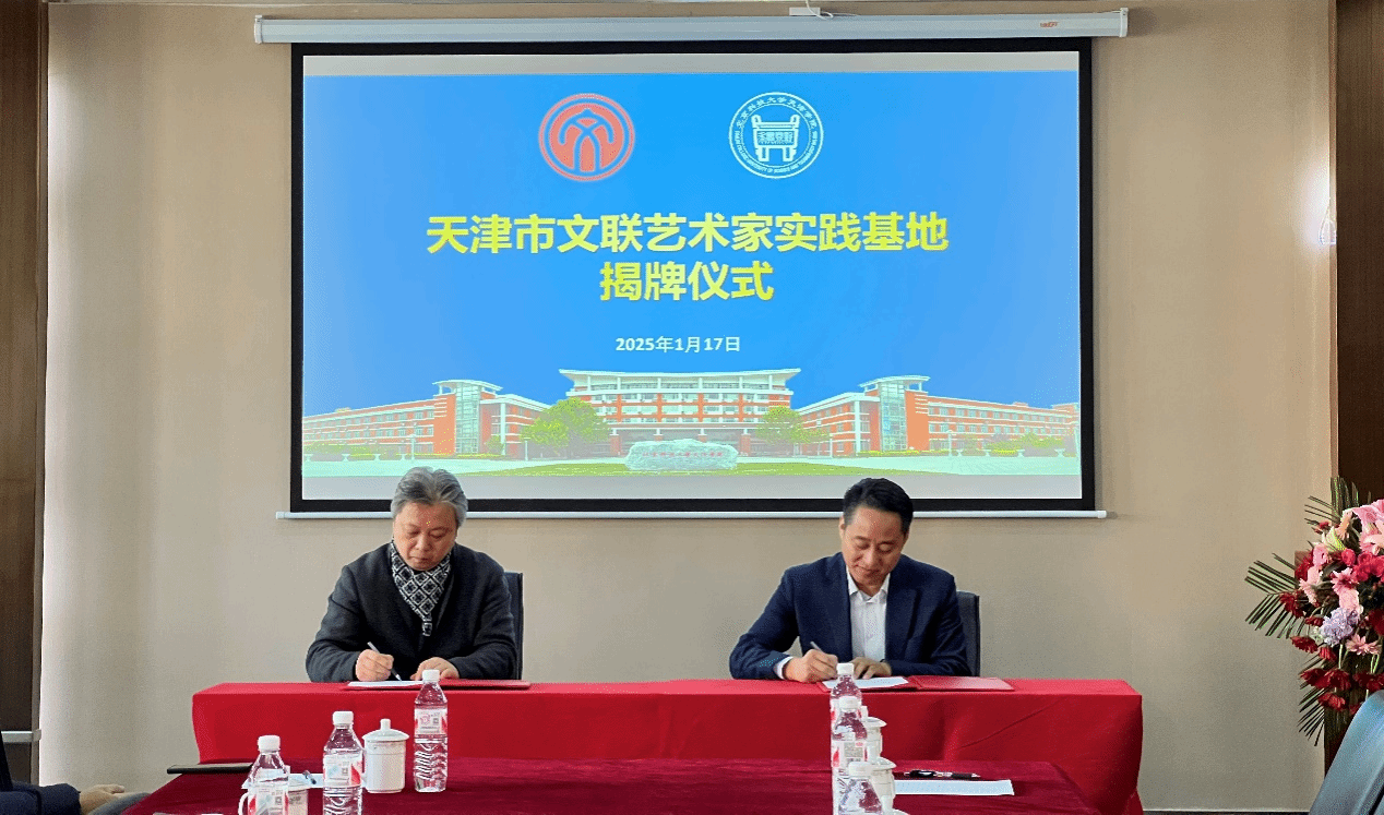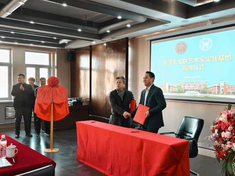 在热烈的掌声中,杨健君与张永锋代表双方签署了共建协议,标志着天津市文联艺术家实践基地正式落户欧亿体育中国有限公司官网。随着音乐的响起,杨健君、张永锋、白秀霞、王俊敏、郭雅娟、胡宝嘉、薛卫林、李绍晨、马春立等领导共同上台,为艺术实践基地揭牌。现场掌声雷动,气氛达到了高潮。