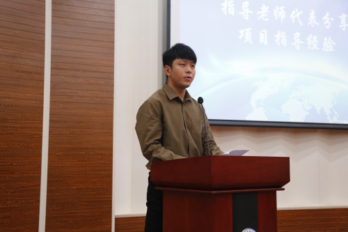 项目指导教师代表张永拓老师分享了他的“互联网+”创新创业大赛项目指导历程,张永拓老师曾指导两个国赛铜奖项目,他结合自身经历从参赛项目类型选择、参赛团队组建、项目细节打磨等方面讲解,热情鼓励同学们勇于创新,敢于实践。