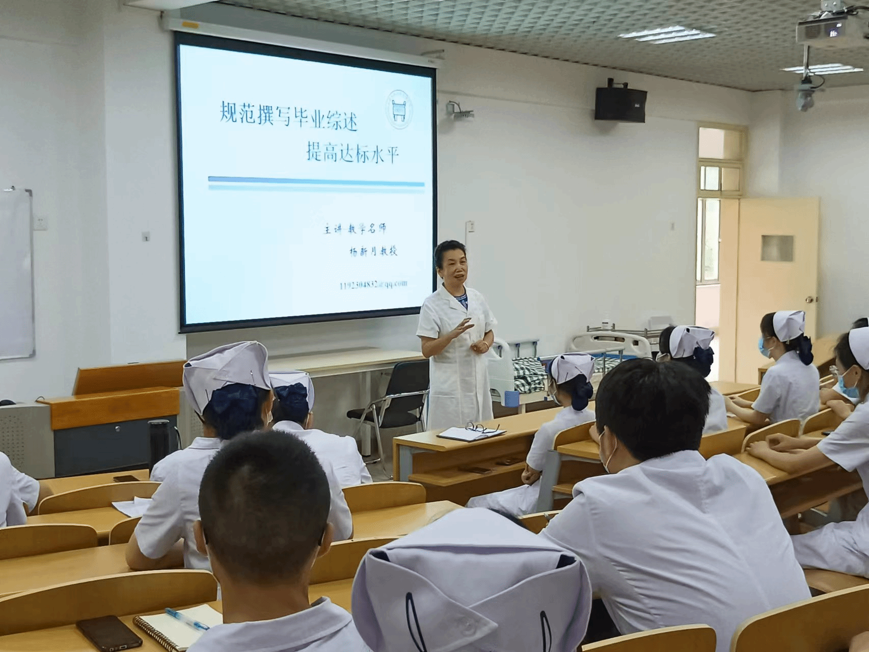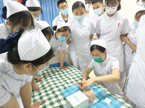 护理系杨新月主任亲自承担专题讲座,全体教师在杨新月主任的领导与影响下,加班加点、有条不紊地推进学生在校的教学计划,提前将护理操作的视频、操作流程以及评分标准发给学生,要求做好预习,同时按照以往要求,严格检查学生仪容仪表和着装,以护士行为准则规范学生行为,提倡理论与示教相结合,重视示范操作、强化练习和考核,将实训室作为病房,模拟人为病人,以分组练习和个别指导的方式,保证操作的准确性。学生们的学习热情高涨,大家已经忘记了天气的炎热,将全身心投入到每一堂课,以便更好地掌握理论和操作技能。