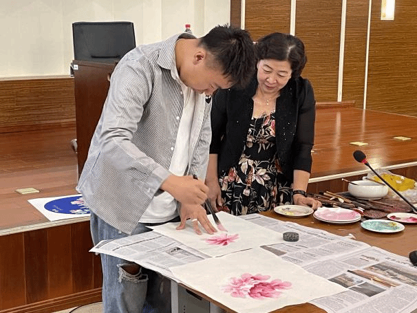冯老师结合自己多年的艺术经验,给同学们讲述画画具备的几个条件:一是要喜欢;二是要眼巧心细;三是要手勤快;四是要大胆落笔,细心收拾。接着,从构图的辨证关系,色彩调配,牡丹的画法三方面介绍了如何画好写意牡丹。理论讲解过后,冯老师现场亲自为师生作画,几笔就已勾勒出牡丹之态,接着以娴熟的技巧赋予了牡丹独特的灵性与芬芳,实乃国色天香。冯老师完成作品后,引导在场学生上台体验现场作画,冯老师在旁耐心指导,同学们在互动中领略到传统文化精髓。
