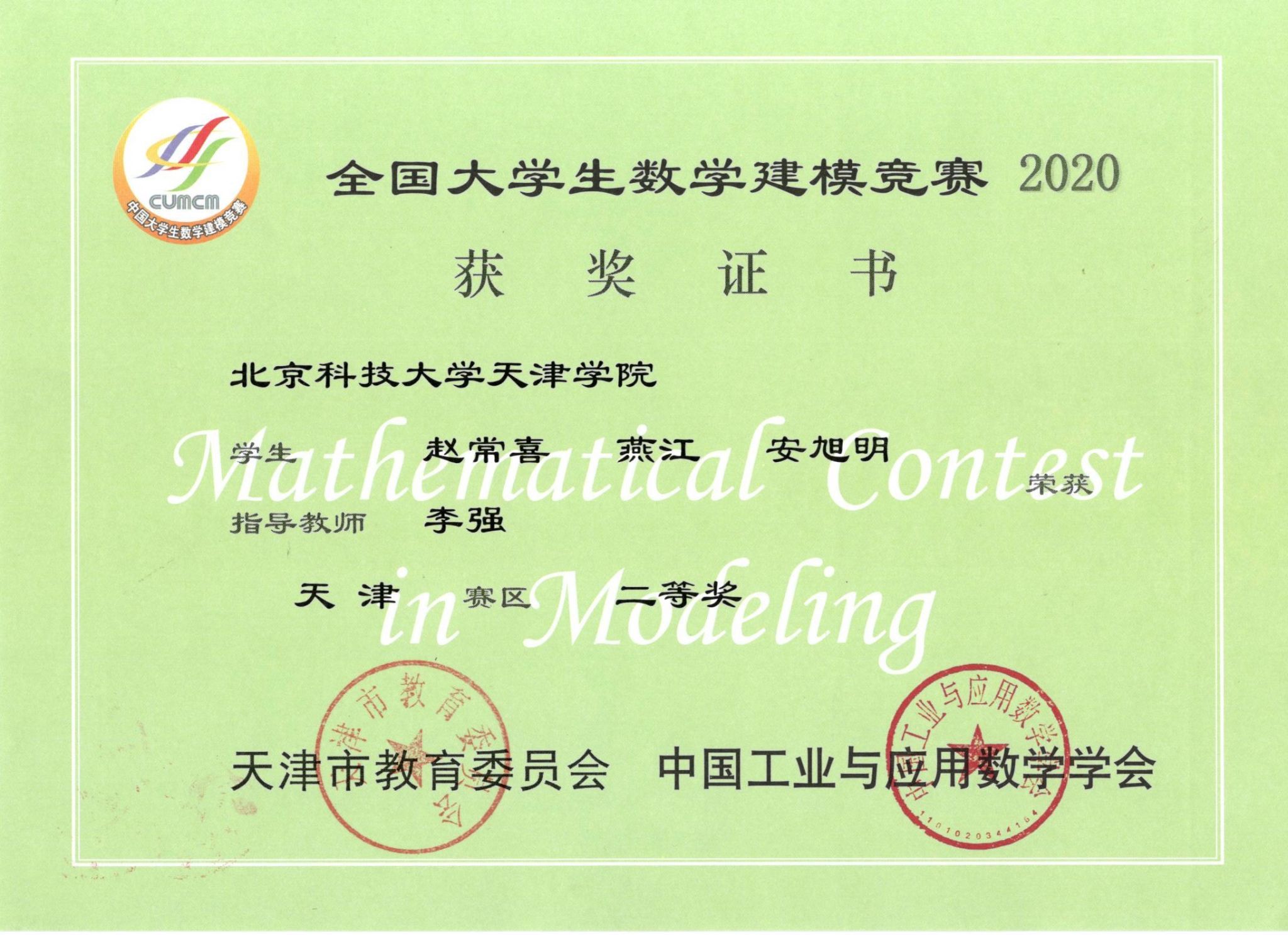2020年全国大学生数学建模竞赛于2020年9月10日(周四)18时至9月13日(周日)20时于线上参赛。这是第一次在线上进行数学建模,由于数学建模竞赛的特点是需要组队连续进行的,所以线上参赛就给比赛带来了许多困难,也增加了许多的难度。面对这种特殊的情况,基础部数学建模团队的指导老师们积极想办法出对策,经过指导教师和参赛学生的共同努力,最终获得天津市一等奖1队(共3名学生),天津市二等奖2队(共6名学生)。