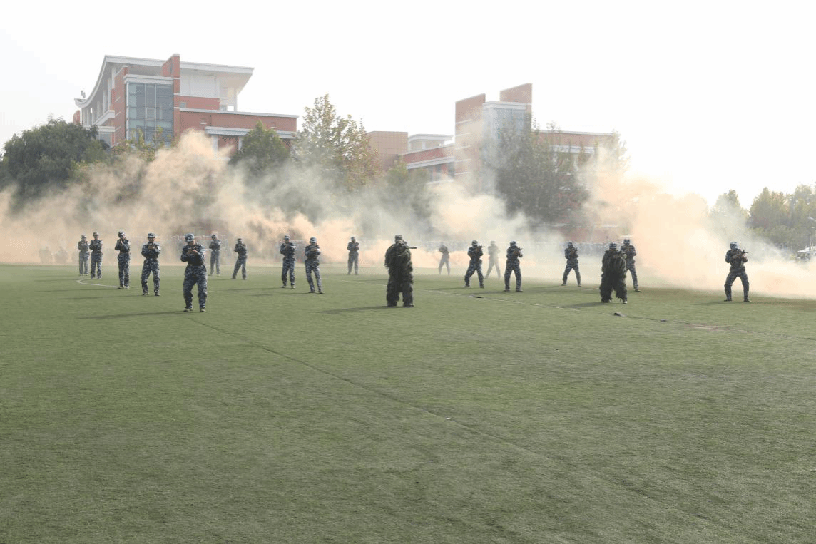 分列式方队迈着整齐的步伐,喊着嘹亮的口号,昂首挺胸,率先从主席台走过。孔武有力的的刺杀操、紧张有序的战场救护演练、气贯长虹的应急棍、杀声震天的匕首操、整齐划一的海军旗语、气势恢宏的擒敌拳,每一场表演都赢得了全场师生的掌声。花样队列表演中同学们踏着军歌旋律,摆出 “贝壳田园”“祖国万岁”等字样和“中国地图”图案,一声声响亮的口号将现场气氛推向了高潮。