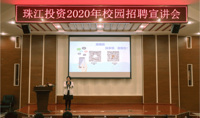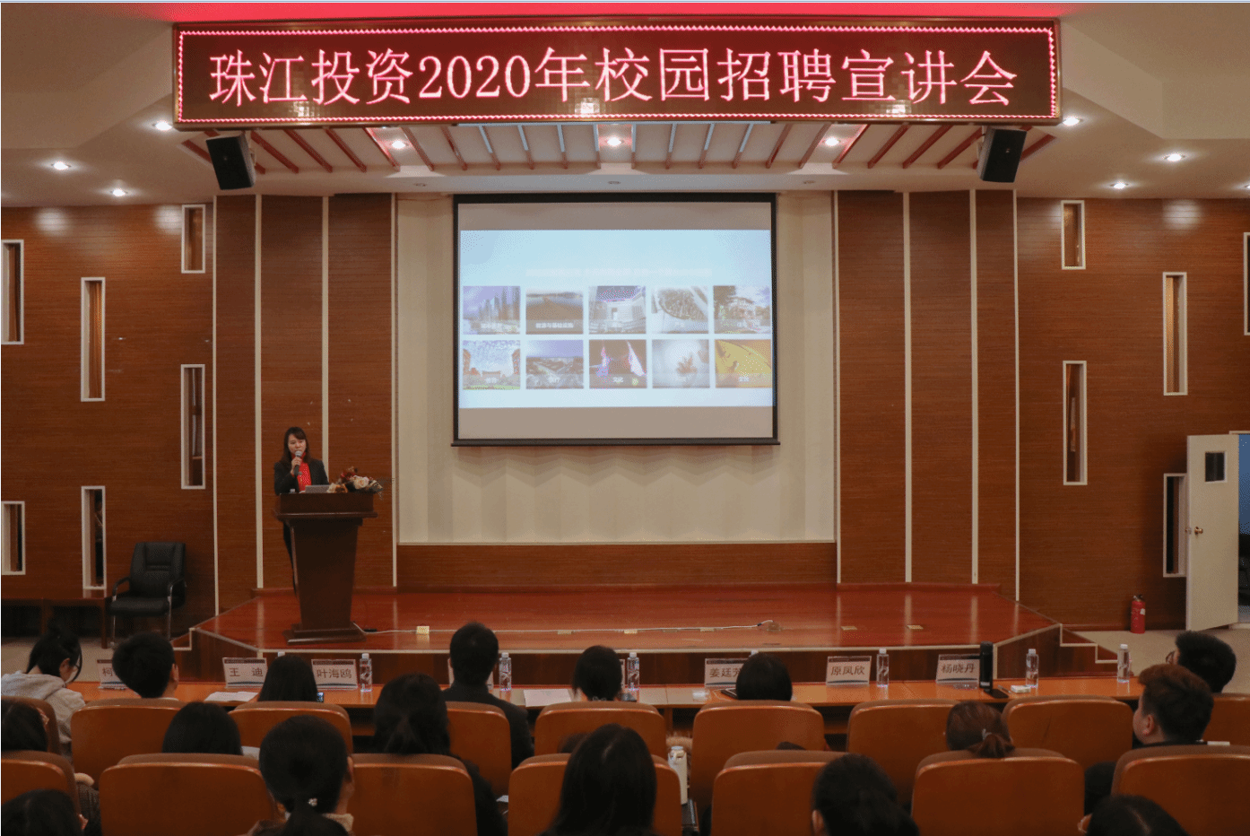 宣讲会在广州珠江投资股份有限公司的宣传视频中拉开帷幕,珠江投资股份集团培训发展部经理杨晓丹分别为毕业生介绍了公司的发展状况以及人才培养体系,并重点介绍了珠江投资集团重视青年新生力量培养,2019年推出“新生力精英班计划”和“新生力计划”两大计划。