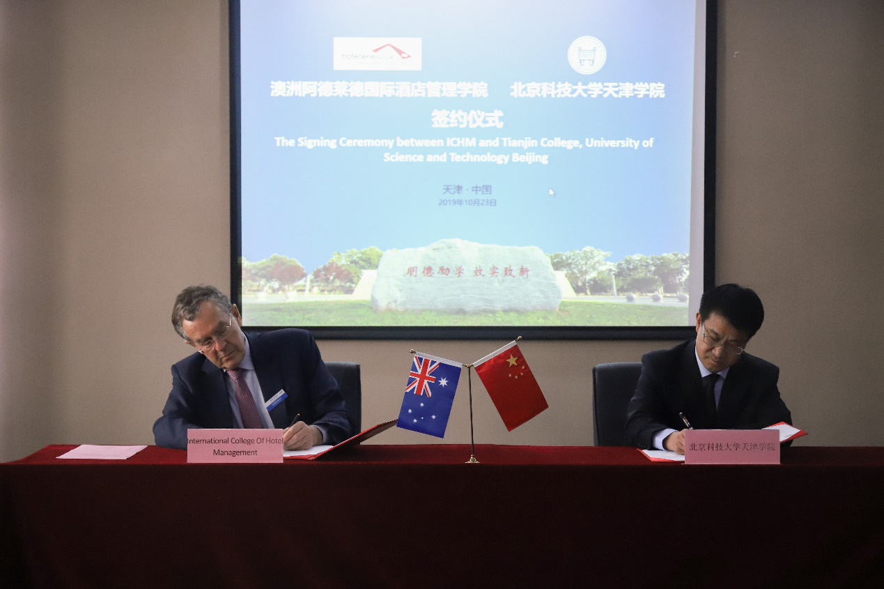 签约仪式开始前,双方校长致辞并进行深入交谈,从各自历史发展、学科建设、合作交流等方面,就双方国际化教育合作发展领域及前景交换意见并达成共识,合作前景广阔,潜力巨大。天津学院院长王斌介绍了我院的学校概况及办学特色,对于与ICHM的合作,我院表示愿意在未来酒店管理业相关教育培训发展道路中携手并进,勇创佳绩。ICHM校长Gerald Lipman也介绍了学校情况,并表示在过去25年间,旅游业和酒店管理业的飞速发展,带来了广阔的专业技能和职业培训教育机遇。世界期待着中国的高端国际酒店管理人才的诞生。双方在友好热烈的氛围下签订合作协议。