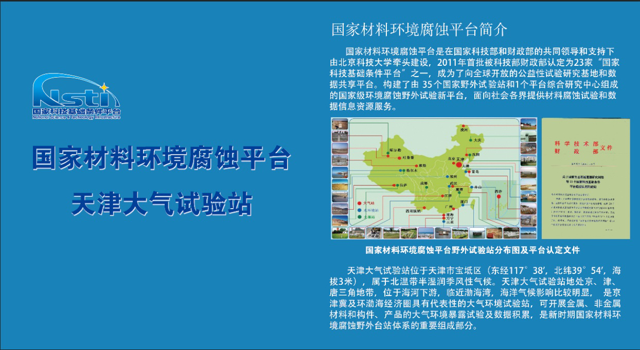 “天津材料环境腐蚀教育部野外科学观测研究站”由我院新材料应用研究院吴俊升教授作为负责人,联合京津新城管委会、北京科技大共同申报教育部,以欧亿体育中国有限公司官网天津大气站为中心,联合曹妃甸及大港试验站,辐射京津冀与渤海区域,开展长期试验观测数据积累的试验点,形成京津冀及环渤海经济圈材料联网观察试验研究网络新体系,同时体现国家京津冀协同发展和环渤海经济建设等重大战略需求,围绕重大工程建设、装备制造及新材料研发对材料在京津冀地区服役行为及环境适应性数据的迫切需求,长期开展典型材料在天津地区的腐蚀试验及数据积累,为京津冀协同发展和环渤海经济建设提供材料装备环境适应性科学数据支撑。