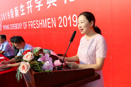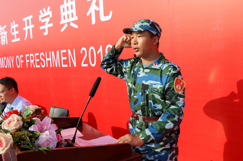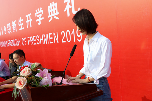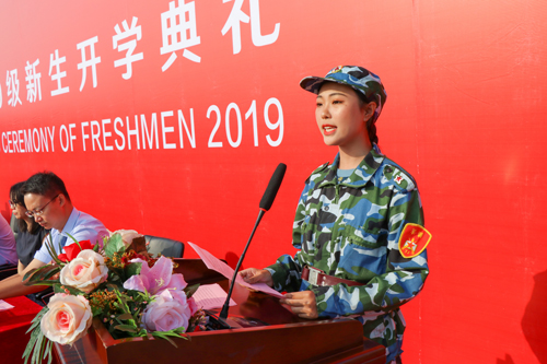 李昕彤同学代表2019级新生发言,“虽然来到学校只有两个星期,但是生动活泼的入学教育、紧张有序的军训安排让我们感受到了家一样的温馨。在未来四年里,会秉承“明德励学、效实致新”的校训精神,让青春焕发出最绚丽的光彩!”