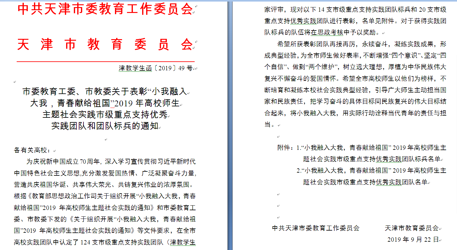 为庆祝新中国成立70周年,深入学习宣传贯彻习近平新时代中国特色社会主义思想,充分激发爱国热情,广泛凝聚奋斗力量,营造共庆祖国华诞、共享伟大荣光、共铸复兴伟业的浓厚氛围,教育部、市教工委及市教委组织开展“小我融入大我,青春献给祖国”2019年高校师生主题社会实践活动,我院青年志愿者协会“红星照耀新青年”社会实践团荣获2019年高校师生主题社会实践市级重点支持优秀实践团队。
