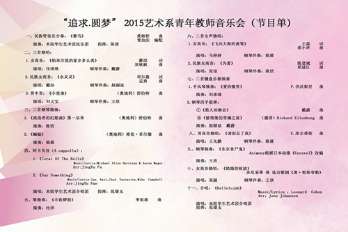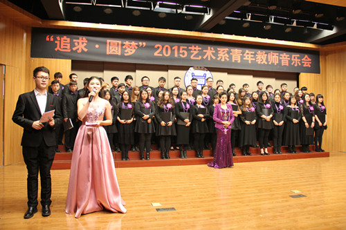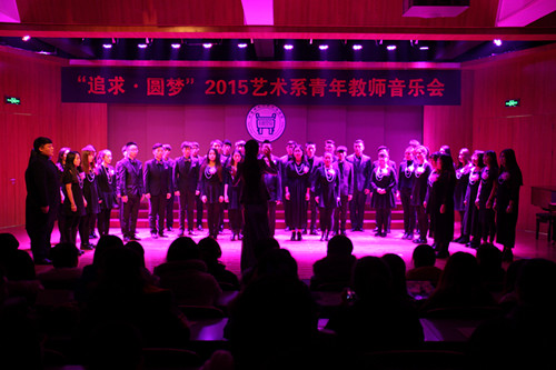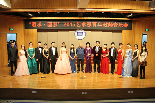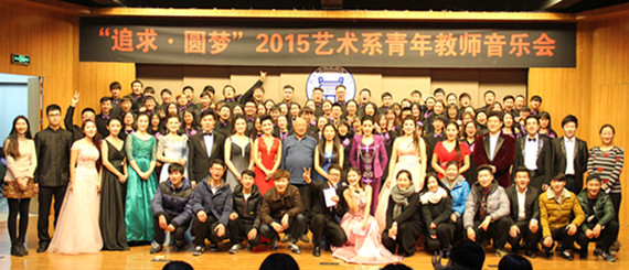 音乐会以“追求·圆梦”为主题,展示了艺术系青年教师积极向上、拼搏进取的精神风貌。音乐会以由青年教师陈倩担任指挥,院学生艺术团民乐团演奏的民族管弦乐合奏《赛马》开场,共有11个节目,涵盖民族管弦乐合奏、合唱、美声独唱、民族声乐独唱、钢琴独奏、钢琴四手联弹、手风琴独奏、古筝独奏等多个类型,展示出了艺术系教师精湛的专业水平和综合全面的个人能力。演出在由青年教师范璟玉担任指挥,院学生艺术团合唱团演唱的大合唱《Hallelujah》中结束。音乐会获得了全院师生的广泛好评。系主任胡建华教授、艺术教育中心主任林碧芸与各演职人员合影留念,并鼓励教师继续努力提高专业水平和加强个人修养,争取再创佳绩,为艺术系赢得更多的荣誉,为学生树立良好的榜样。