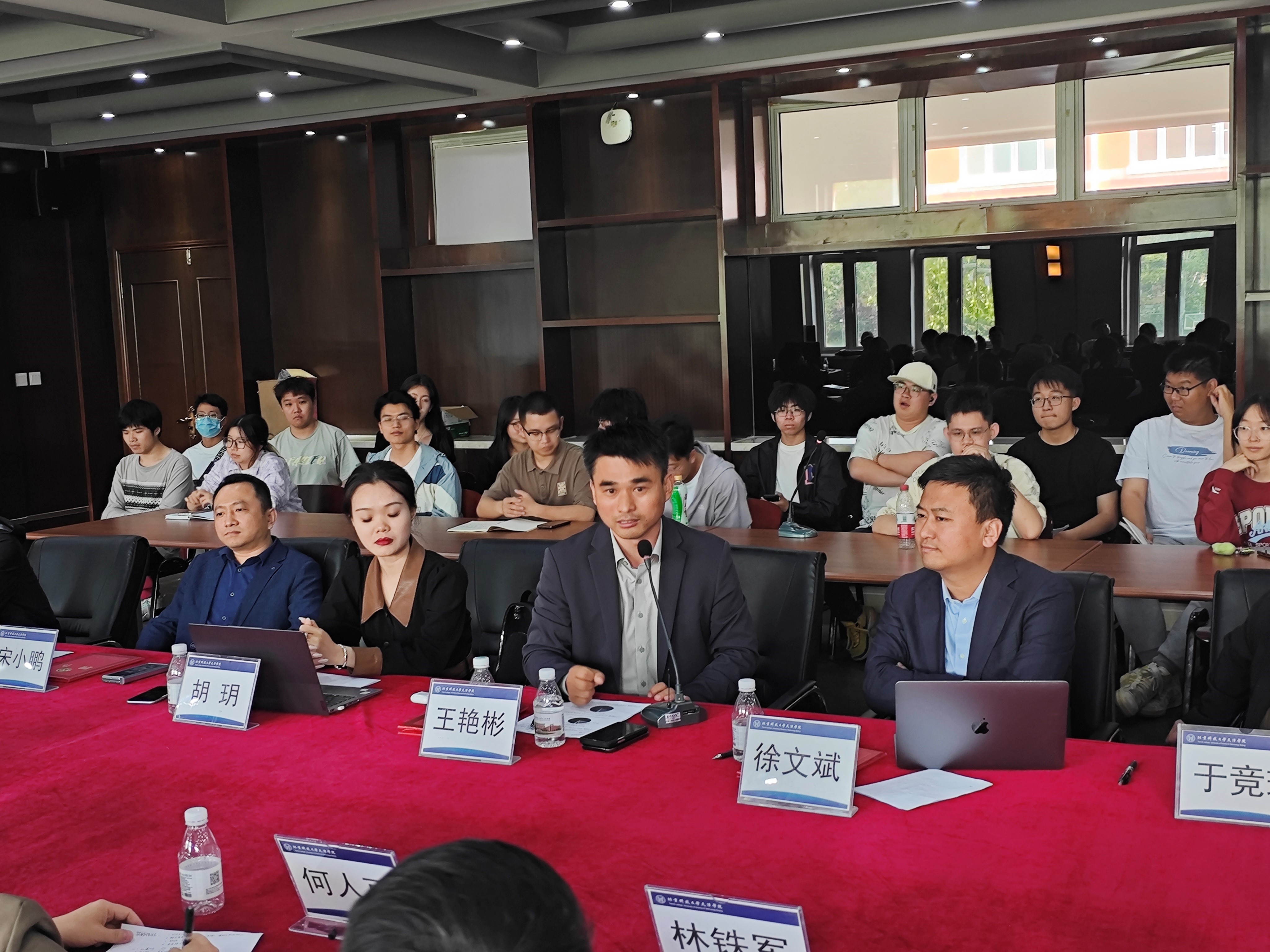 5月8日15时,法律系“法律实务专家进校园”第二期活动在理工图书馆209成功举办。本期活动以“菁英律师与你共话--如何成长为优秀的法律人”为主题,特邀北京君都律师事务所高级合伙人、资深律师、我院兼职教授于竞琪,北京高沃律师事务所高级合伙人、资深律师宋小鹏,北京君都律师事务所高级合伙人、资深律师徐文斌,北京君都律师事务所高级合伙人、资深律师王艳彬四位菁英律师作为嘉宾走进校园,分享自己法学求学经验和律师工作经验,并与法律系学生面对面座谈。本次活动由法律系常务副主任邢晓晖主持,刘国平、何人可、林铁军、董祺等老师以及六十余名法律系学生参加。