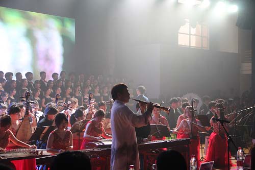 学生艺术团管弦乐团演奏《一枝茉莉送给党》,乐曲像潮水般奔腾而出,曼妙的旋律表达了对党的浓厚感情。