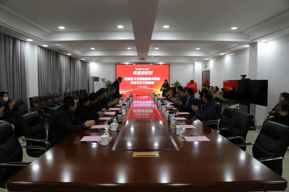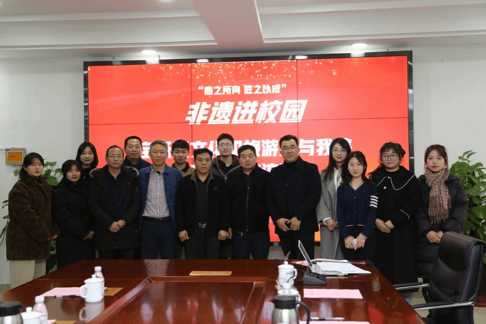 为进一步推动非物质文化遗产的保护和传承,弘扬中华优秀传统文化,12月11日上午,“心之所向、匠之以成”非遗进校园——宝坻区文化和旅游局与我院非遗文化交流活动在300会议室举行。宝坻区文化旅游局副局长张英、宝坻区文化旅游局三级高级主办阮洪臣,宝坻区文化旅游局非遗科科长张宝政,非遗传承人李绍晨、辛宇伶、王金啟、谢学华、刘宝明、杨洪顺,学院院长丁煦生,党委书记叶振楠,副院长张永锋,副院长兼财务总监王俊敏,院长助理、学术委员会主席宋存义,艺术学院院长胡宝嘉、艺术设计系常务副主任李文红及宝坻区文化遗产科全体成员、学院师生代表参加本次活动。