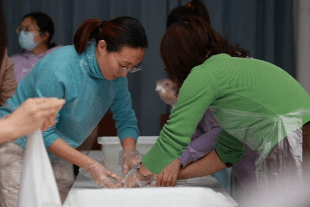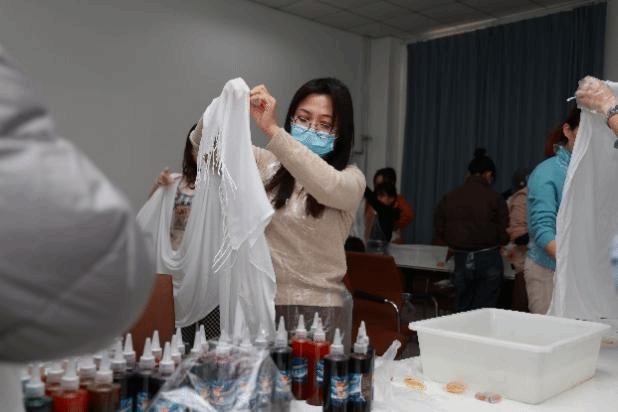老师们在扎染的技法中感受中华民族传统文化的韵味,相互分享着动手扎染的体会和收获的喜悦,现场气氛热烈融洽,通过此次活动,了解了扎染知识,学到了扎染的技巧,切身感受到非遗文化的魅力,加深了对非遗传统文化传承的思考与见解。工会将继续开展丰富多样的文化传承活动,在丰富大家的精神文化生活的同时,增强传承与保护非物质文化遗产的责任感和使命感。