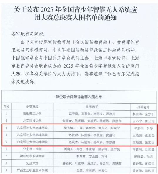 2025年9月30日,由中央宣传部宣传教育局(全民国防教育局)、教育部体育卫生与艺术教育司、中央军委国防动员部政治工作局共同指导,中国航空学会与中国兵工学会共同主办,上海市委宣传部、上海市教育委员会联合承办的 2025 年全国青少年智能无人系统应用大赛总决赛入围名单正式公布,我院无人机系3支队伍成功晋级全国青少年智能无人系统应用大赛陆空联合保障运输赛项全国总决赛。