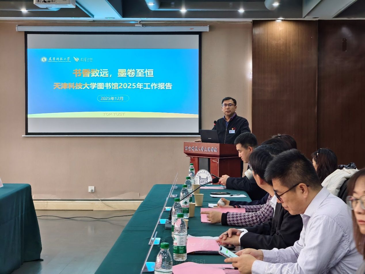天津科技大学图书馆馆长李彦启在会上对我院图书馆工作表示高度认可,特别赞扬了我馆在文献检索课程建设与提升借阅率方面的创新举措。在以“书香致远,墨卷至恒”为题的主旨报告中,他以“引领、精进、合作”三个关键词系统阐述了天津科技大学图书馆2025年的主要工作与成效:一是以政治引领把舵定向,彰显“先锋派儿”,将先锋精神深度融入党建与业务全过程,使其成为图书馆最鲜明的文化标识;二是以持续优化追求卓越,厚植“学术味儿”,通过优化学科服务、加强知识产权支撑、完善文献保障体系等举措,不断提升服务科研与教学的专业能力;三是以开放合作汇聚合力,凸显“科大范儿”,积极推进校内协同、馆际联动、党建合作及校地融合,汇聚发展合力。此外,他还从“传承”与“浸润”两个维度,介绍了该馆在阅读推广、空间环境改造、技术升级、媒体浸润、服务优化及育人实效等方面的具体成果。报告最后,李馆长也客观分析了当前存在的问题,并提出了下一步的发展思路。