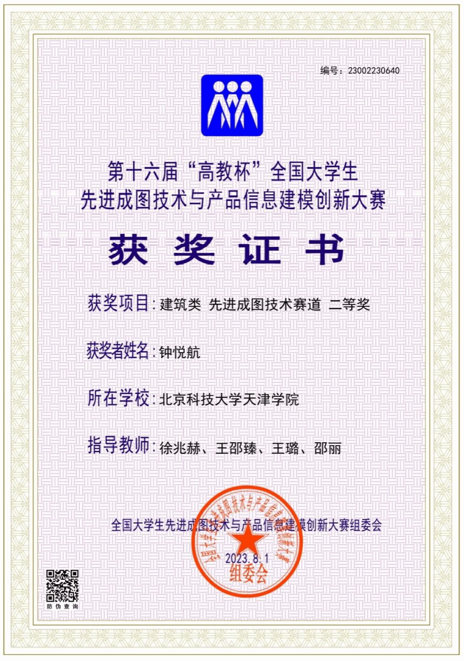 近日,第十六届“高教杯”全国大学生先进成图技术与产品信息建模创新大赛在重庆落下帷幕。我院学生钟悦航(城市建设学院,土木智2101班)荣获建筑类先进成图技术赛道二等奖,指导教师徐兆赫、王邵臻、王璐、邵丽。 ...