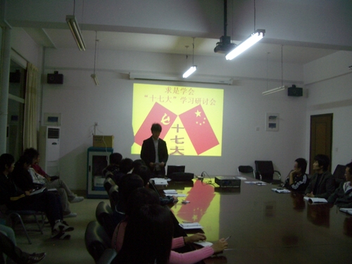 10月18日,我院团委求是学会在行政楼302室召开关于“十七大”政策方针的学习研讨会。求是学会主席团成员及社团部分代表参与了此次研讨会。 大会首先由副主席彭宇佳主持,全体在场成员起立奏国歌...