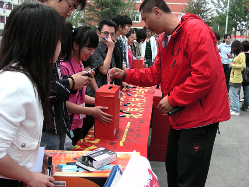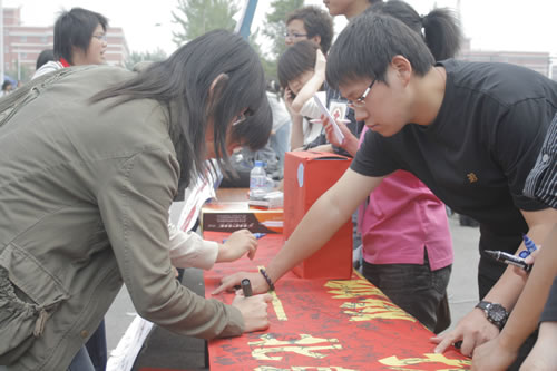 我院学生踊跃填写献血报名表 5月16日,院红十字会在捐款活动之后相继组织的为灾区献血的报名活动在学生三食堂门前举行。报名现场非常热烈,红十字协会贴出了有关献血知识的宣传栏,发放献血宣传单,并发起了报名...