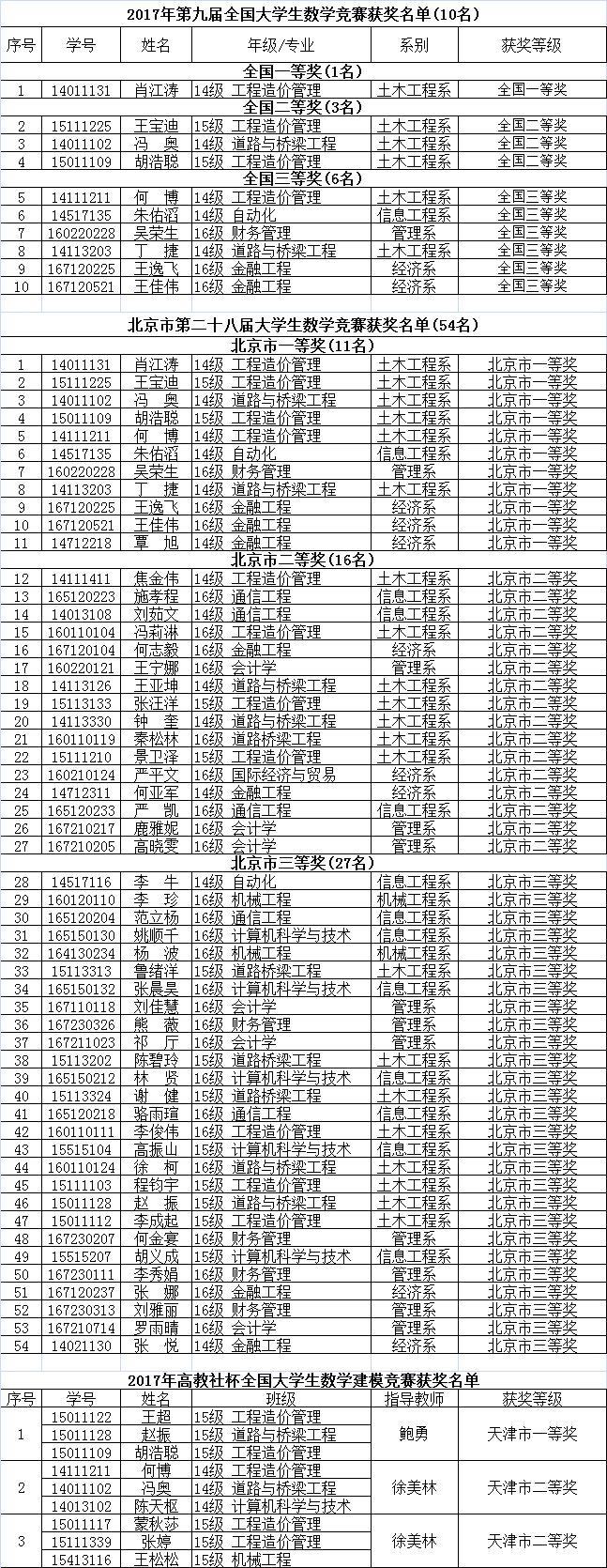 2017 年10 月28 日,第九届全国大学生数学竞赛初赛在全国28个省、市、自治区成功举行。比赛分为数学专业和非数学专业两个类别。我院共有212名同学参加了非数学专业组比赛,土木工程系肖江涛同学获得北京赛区(国家级...