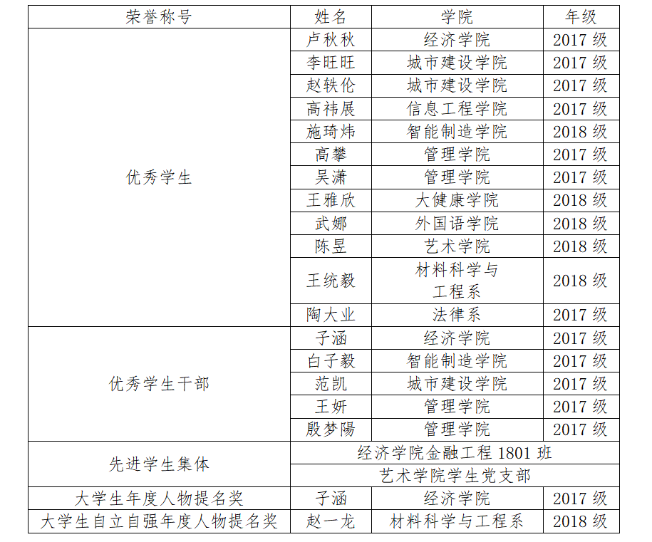 在天津市高等学校2019-2020学年度先进学生集体、先进个人评选中,我院李旺旺等11名同学获评“普通高等学校2019-2020学年度天津市优秀学生”荣誉称号;白子毅等5名同学获评“普通高等学校2019-2020学年度天津市优秀学...