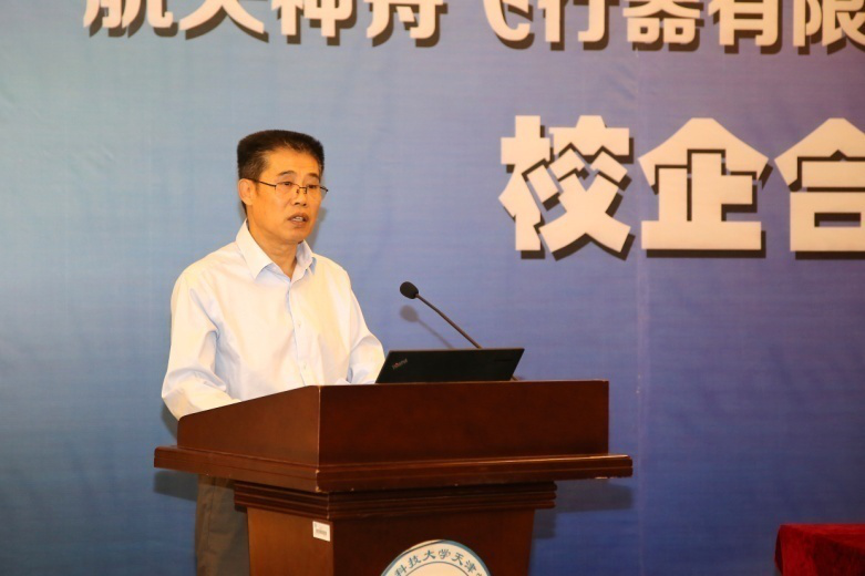 学院党委书记、院长王斌致辞。王院长对关心、支持双方合作的领导与专家表示衷心的感谢。他指出,为贯彻落实习近平总书记提出的“理技融合,研用结合,军民融合”指示精神,近年来学院积极探索“军地联合,校企共育”人才培养模式,助力军民融合产业发展。此次学院与航天神州飞行器有限公司开展校企合作,共建科研与培训基地,是对无人机应用技术成果转化新模式的创新探索,学院将努力为地区经济建设,推动军民融合深度发展做出应有的贡献。