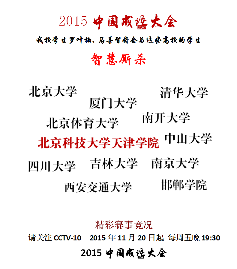 前言:中国成语大会是由中国汉字语言委员会主办,中央电视台承办的一档大型文化综艺节目,自2014年第一期开播以来就受到社会各界的广泛好评。我院学生罗叶楠、马善智是成语大会的忠实粉丝,自第一季成语大会播出后,就开始自学成语、研究典故,经过充分准备,并经过全国海选,两人于今年10月21日来到古城邯郸参与全国24强的角逐。