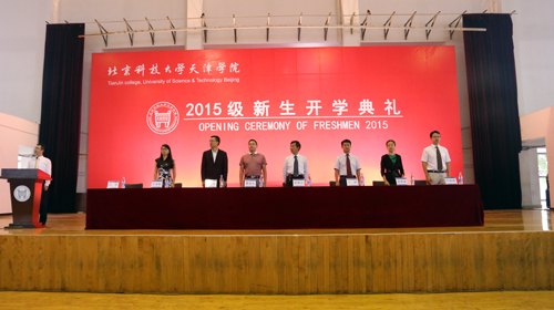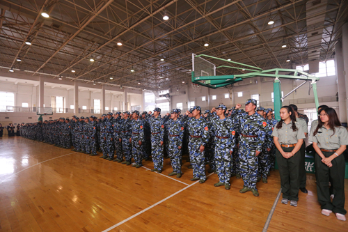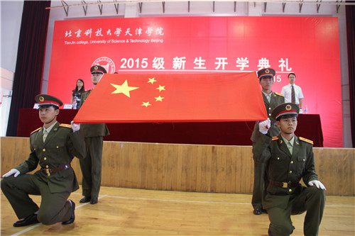 2015级全体新生身着军装在体育馆列队。伴随着艺术团管乐团现场演奏的国歌,典礼正式开始。