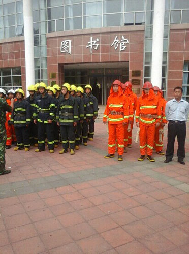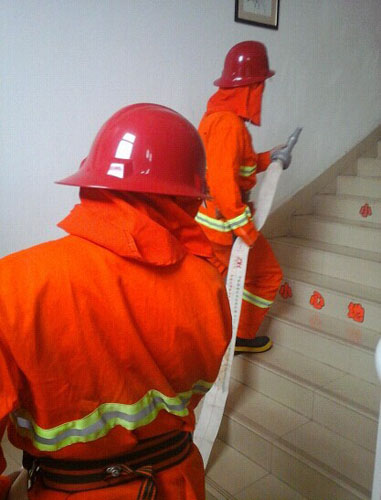 2、战斗展开。根据我院社科图书馆消防平面图的路线指引,消防官兵在我院处突小分队成员的带领下寻找最佳路线,本着救人第一、灭火第二的原则,在有效封堵火势蔓延的前提下,对火场展开总攻。