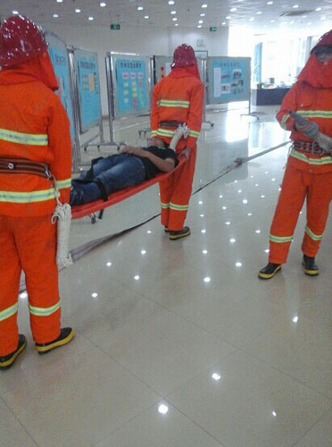 3、火场搜救。消防官兵及我院处突小分队成员利用现有消防救援工具及通过询问火灾逃生人员的口中了解其它受困人员具体方位,对整个火灾现场进行被困人员搜救。