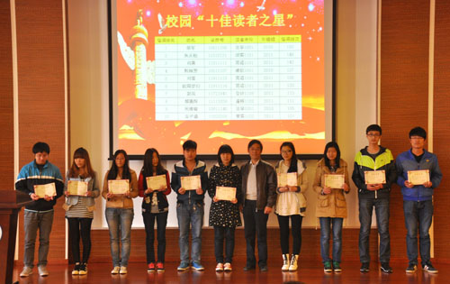 会上,王瑞存介绍了“纪念4.23世界读书日系列活动”的举办情况。据悉,本次活动以“播洒书香,溢满校园”为主题,旨在引导读者走进图书馆,弘扬读书传统,兴起读书热潮,营造共建书香校园的良好氛围。活动期间开展了校园“十佳读者之星”评选、第四届“信息检索技能大赛”、“春之声”读书心得演讲大赛、“我和图书馆那些事儿”征文、大型读书签名、“图书馆印象摄影”、图书馆“书法展”、图书导读之“阅读疗法”、“图书漂流”、“书籍保护周”等10大活动。活动从创意、发动、组织、评奖历时近2个月,共收集征文31篇、摄影作品近200幅、书法作品20多幅、学生赠书 200余册。经过评审,胡军、朱天柱、刘燕、韩林芳、刘菲、欧阳梦幻、赵岚、郝鹏辉、周雅敏、高子涵被评为“十佳读者之星”;机械工程系李宗霖获得“信息检索大赛”一等奖;(机械工程系1203班钟鑫权)获得摄影大赛一等奖;金融1201班陈宇获得“读书心得演讲比赛”一等奖;会计1209班杨扬获得征文比赛一等奖;土木1105班夏晓东获得图书馆优秀书法作品展一等奖。此外,还评选了图书馆社团先进工作者及《明德报》优秀通讯员。共有49名同学获得奖励。与会领导为获奖同学颁发了证书和奖品,并与获奖同学合影留念。