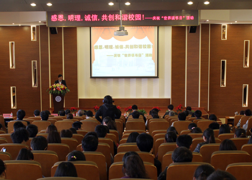 4月底,由图书馆举办、以“感恩,明理,诚信,共创和谐校园!”为主题的世界读书日纪念活动在学术报告厅隆重举行。出席活动的领导有天津高校图书情报工作委员会常务秘书长李广生、学院院长郭景文、副院长曹连东、财务总监刘小鸣、党委副书记盛佳伟,南开大学滨海学院图书馆馆长李文祯、天津财经大学珠江学院图书馆馆长罗鸿铭、北京化工大学北方学院图书馆馆长刘鹤霞、北京科技大学管庄校区图书馆馆长王红艳应邀出席本次活动。此外,学院各系部负责人以及师生代表200多人参加了活动。图书馆读者服务部主任景娜主持纪念活动。