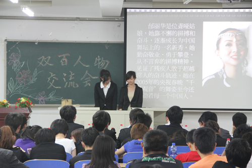 “双百人物”是指100位为新中国成立作出突出贡献的英雄模范人物,100位新中国成立以来感动中国的人物。本次活动以学生会14个部门为单位选取双百人物依次进行介绍交流,然后由主席团对主讲人进行提问交流,旨在让大家更好的学习双百精神,为同学们的实际工作和学习注入强大的精神力量。