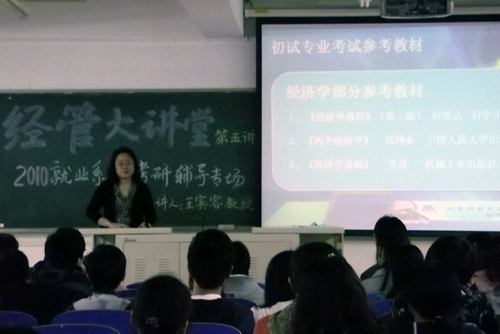 9月29日,经管大讲第五讲——2011届毕业生就业系列考研辅导专场在9教201拉开了帷幕。此次经管大讲堂由经济系主任王宾容教授主讲,经济系党总支书记岳强、管理系分团委书记谢锦程以及毕业生辅导员出席了本次交流会。