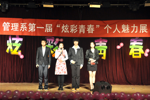 为响应学院团委注重大学生综合素质拓展的号召,管理系分团委积极开展各项活动,旨在拓展学生素质,突显个性发展。12月1日晚,管理系第一届“炫彩青春”个人魅力展在学生活动中心举行。